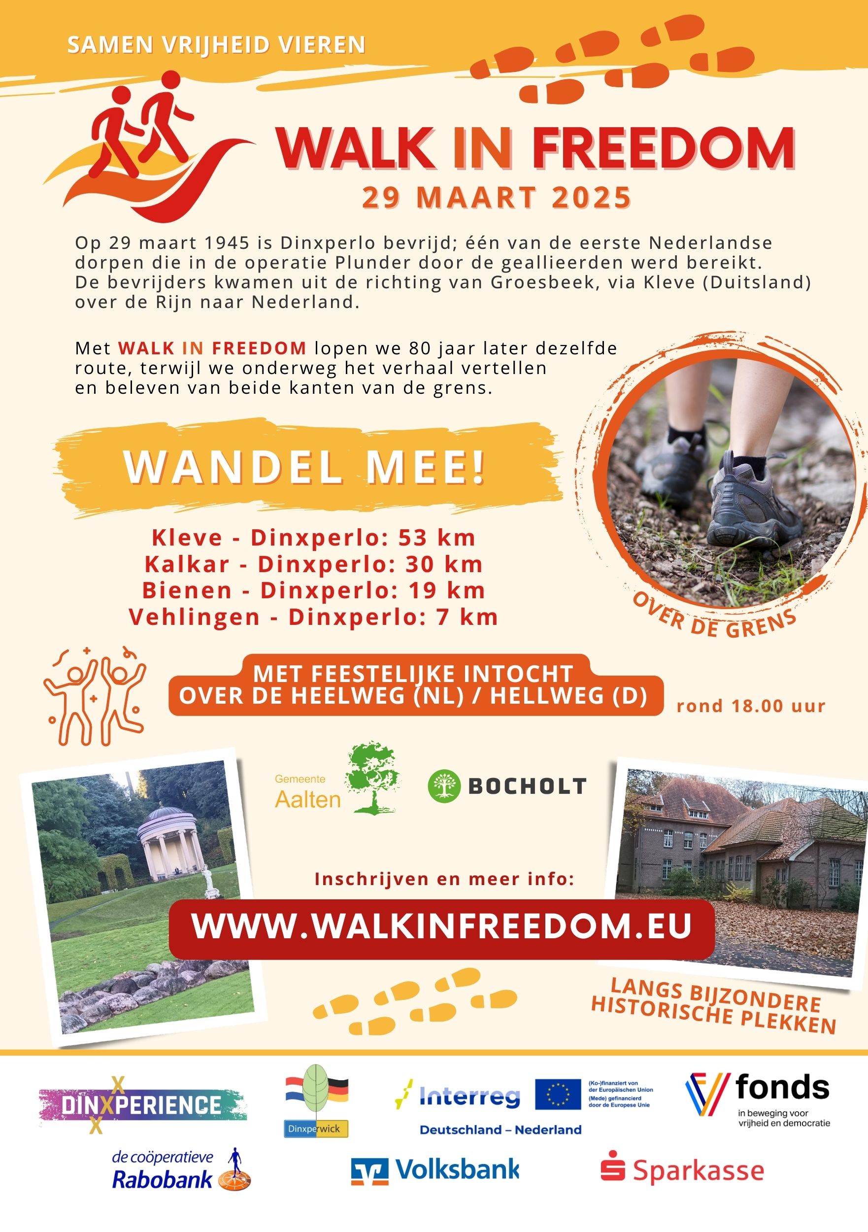 Op 29 maart vindt de wandeling ‘Walk in Freedom’ plaats in het kader van de nationale viering van ‘80 jaar Vrijheid’, die officieel op 12 september 2024 van start is gegaan. Op 29 maart 1945 werd Dinxperlo bevrijd vanaf de Nederrijn met een groots opgezette operatie van de geallieerde troepen die bij Rees de Rijn overstaken om via het oosten de rest van Nederland te bevrijden en door te stoten naar de grote steden in Noord-Duitsland.